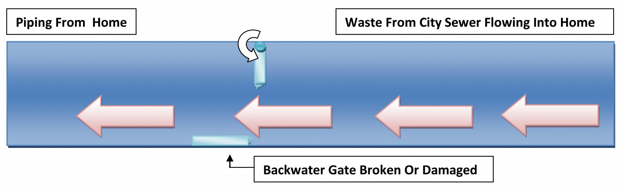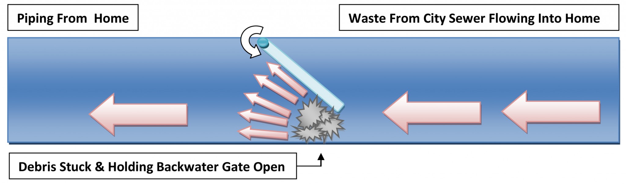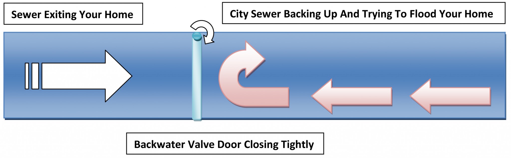 Sometimes backup occurs within a city waste water system do to a blockage or excessive rainfall. If this occurs and sewage begins to flow back towards the dwelling, the valve is automatically activated to stop sewage from flooding the home, as shown below. Unfortunately, when the gate is closed, residence of the home are unable to use toilets, sinks or other fixtures within the building, but once the blockage is cleared and the valve reopens all plumbing fixtures can be used again. The backwater valve has saved the home from damage and done its job.