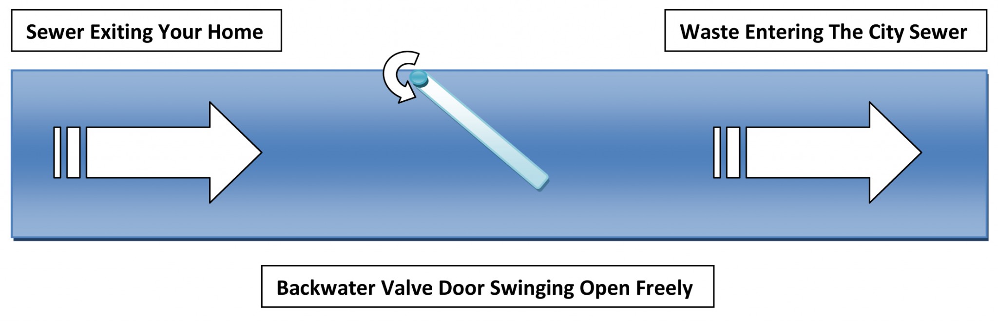 These devices are very similar to a one way street. Traffic can and should only flow in one direction much like your sewer. Sewage is only supposed to go one way and that way is OUT! A backwater valve has what is called a gate built into the device. As seen below, under normal conditions, the backwater valve’s gate opens and allows sewage to leave the home unchecked.