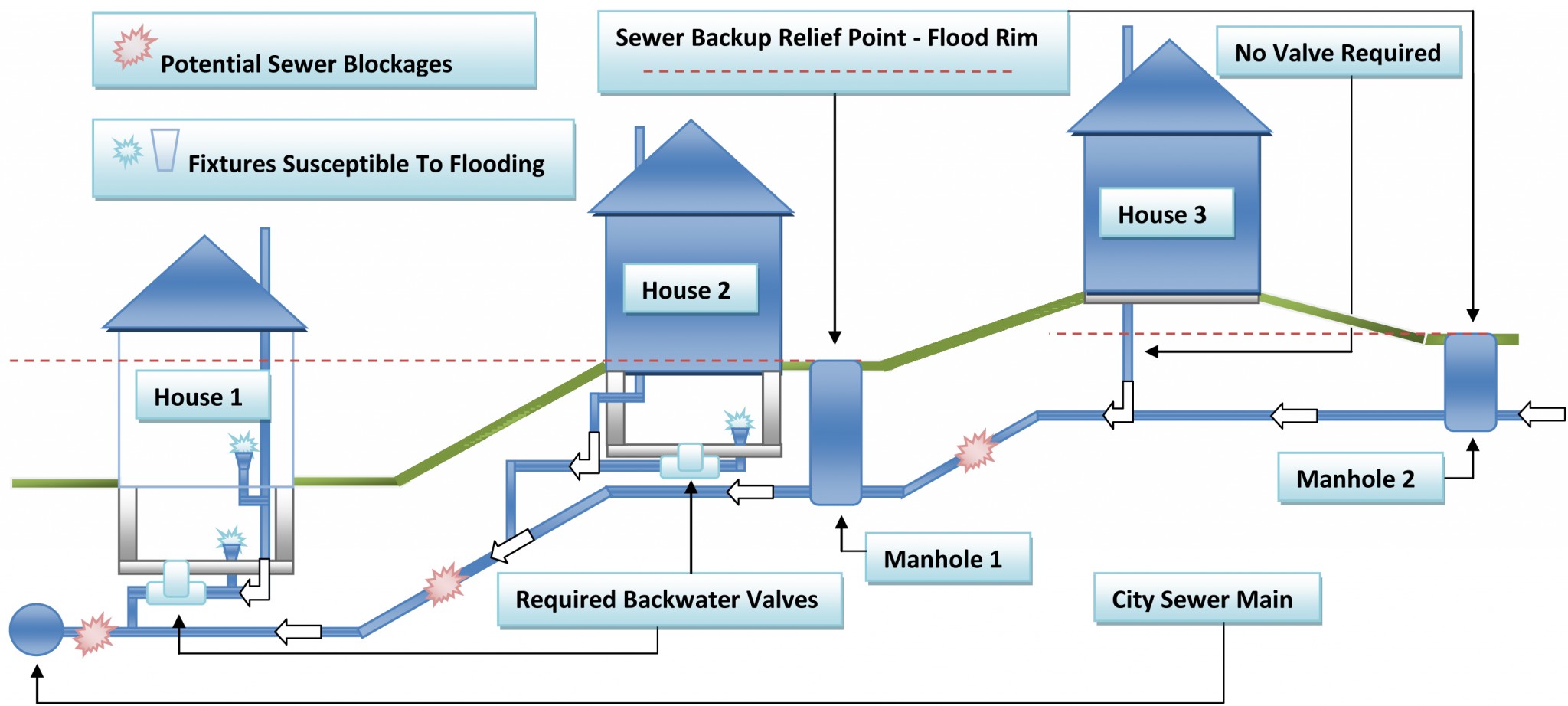 Examining the second home, you can see that it has potential to flood as well, but only the basement is at risk. So the backwater valve is required only on that sewer branch.
