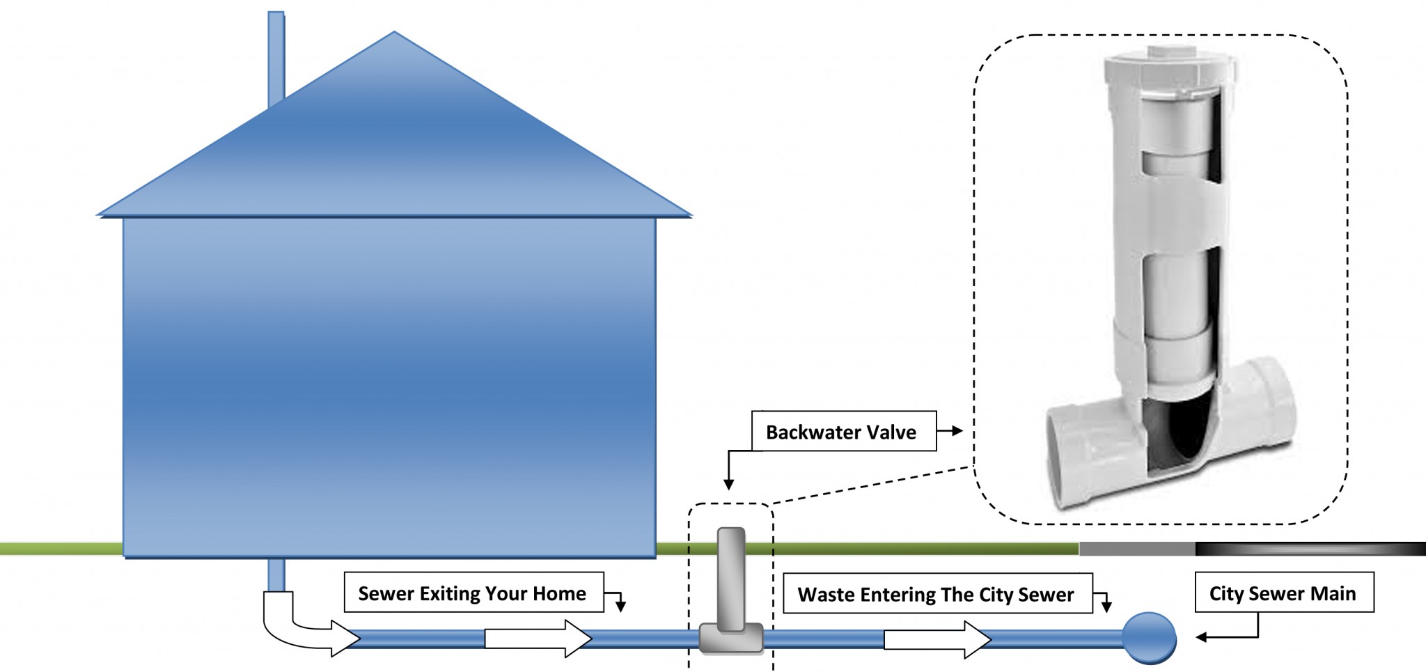 A backwater valve is a plumbing device put in place to prevent raw sewage from backing up into a home. Most properties by default prevent sewage backups due to their piping design or location in relation to grade. For homes with certain plumbing system limitations, or those structures located below the elevation of city sewer manholes, a backwater valve is a must. If the public sewer system gets backed up, these devices will prevent sewage from entering the dwelling through floor drains and fixtures. Above is a diagram of a backwater valve installed on the exterior of a home, which is an ideal installation location for servicing. These can also be install on the interior of a home, such as a basement, where landscaping or structures prohibit.
