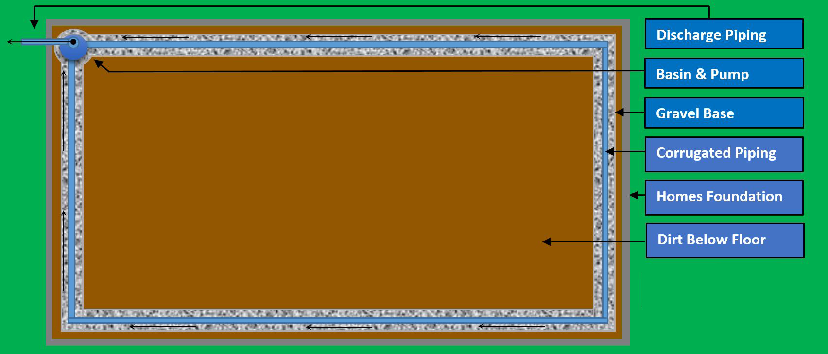 Now looking at Figure #2 HERE, this is a bird’s eye view of a home’s basement floor, minus the concrete slab.  As you can see this installation consist of corrugated piping surrounding the entire perimeter of the homes foundation. The piping is pitched to drain into the catch basin so groundwater will flow by the force of gravity. You can also see that the entire developed length of the piping is surrounded by gravel. Remember, the gravel will allow groundwater to flow with ease into our drain tile pipe, dump into the pit and then be pumped safely away from the home. With this type of installation, you as a homeowner will maximize the reduced risk of water entering your basement.