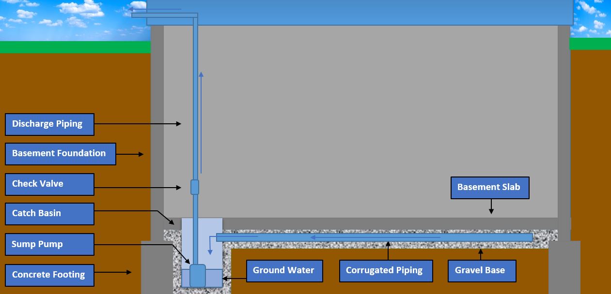 Examining Figure #1 HERE, this a side view of a home sump pump installation. Notice the submersible pump is placed in the bottom of the pit. This pit or catch basin collects water throughout the perimeter of the basement via corrugated piping (also known as drain tile). This type of piping is designed to let water in through tiny weeping holes and then channel it in the desired direction based on pitch.  Also, you can see that the piping is embedded in a gravel base. The gravel surrounding the drain tile piping allows ground water to flow in with ease, while eliminating debris and mud from clogging up the system. Once the water is migrated to the sump it is then discharged by the pump via the pipe stack away from the home. The pump, powered by electricity, will turn off and on based on the water level within the basin, eliminating the need for the homeowner to manually activate it.